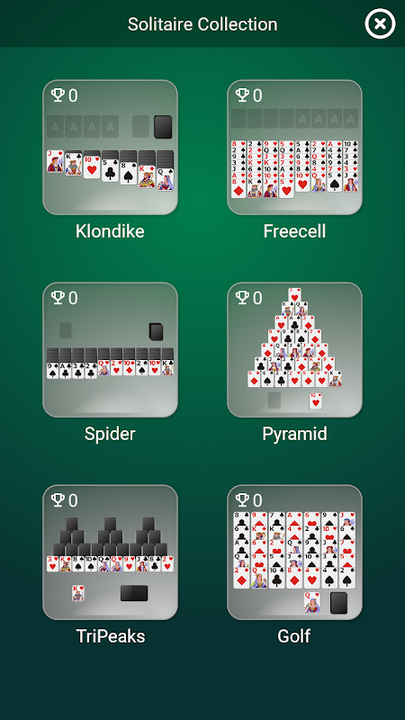 A Solitaire games collection: Klondike, Freecell, Spider, TriPeaks, etc.