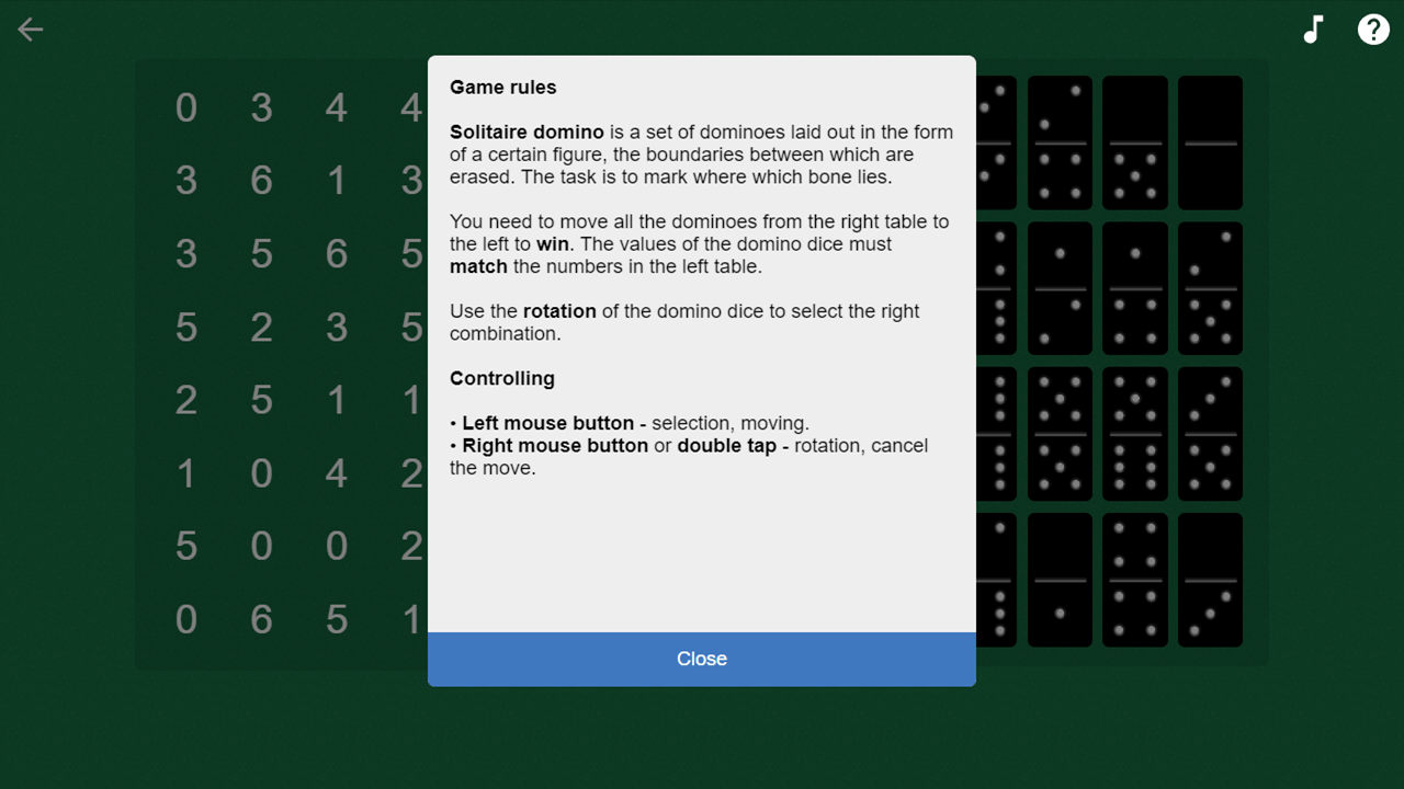 To win, you need to move all the dominoes from the right table to the left. The values of the domino dice must match the numbers in the left table. To select the right combination, use the rotation of the domino dice.
