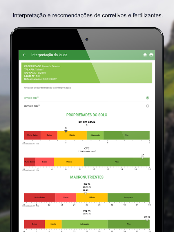 Solo One is the tool that was missing for agronomists, agricultural technicians and farmers. The application makes interpretation of soil analysis (macro and micronutrients) and makes correction recommendation and production quickly and intuitively.