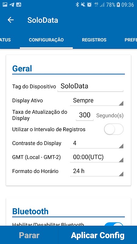 Aplicativo de configuração, monitoramento e coleta de dados do dispositivo Solodata.