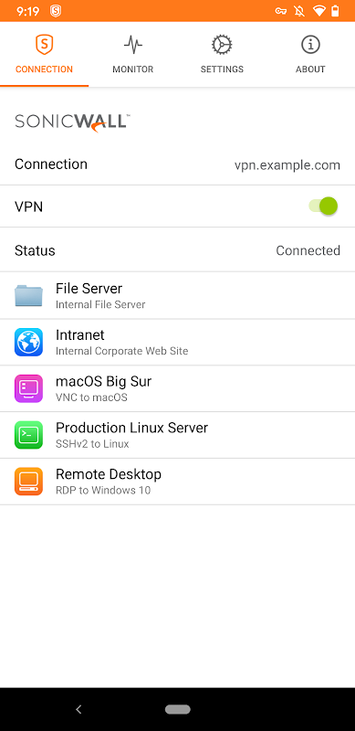 SonicWall Mobile Connect™ provides users full network-level access to corporate and academic resources over encrypted SSL VPN connections. The client provides anytime, anywhere access to critical applications such as email, virtual desktop sessions and other Android applications.