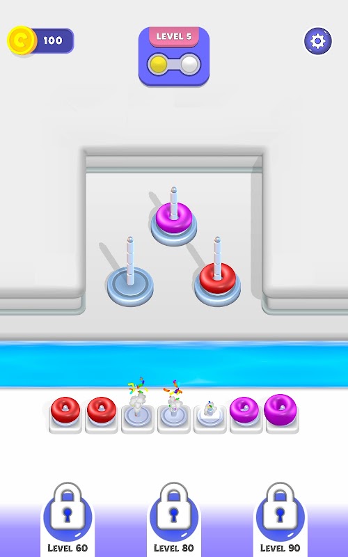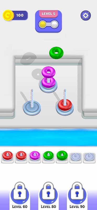 Sort Merge 3D is the kind of game that's bound to captivate you for an extended period! This addictive pastime invites you to immerse yourself in the art of problem-solving through the meticulous arrangement of vibrant hoops. Get ready for a mental workout as you tackle the challenge of stacking these colorful rings. You'll need to employ your cognitive skills, craft strategies, and anticipate each move in order to succeed.