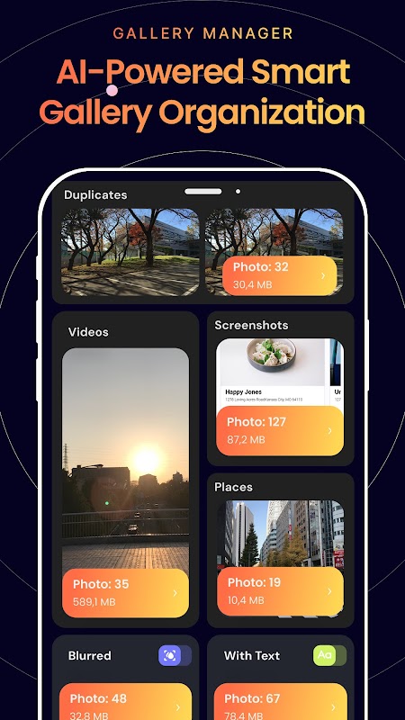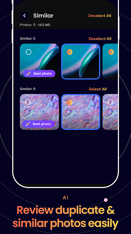 Smart AI gallery to organize photos by similarity, duplicates, blur, categories