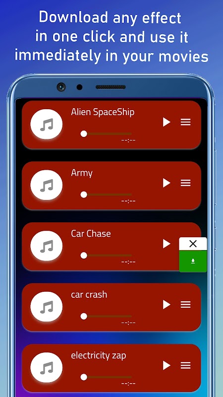 It is a free application that contains action sound effects. Helps you add suspense, enthusiasm and realism to your films and projects. The application is easy to browse and direct download with one click to save the sound effect to your device and then use it easily on any video editing application.