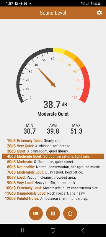 Measure noise levels in real-time with dB gauge, graph, and min/avg/max tracking