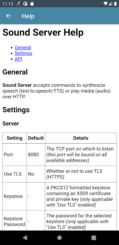 The embedded server is configurable and supports TLS and Basic Authentication to ensure the legitimacy of requests. The text-to-speech functionality supports all speech engines and locales installed on the device.