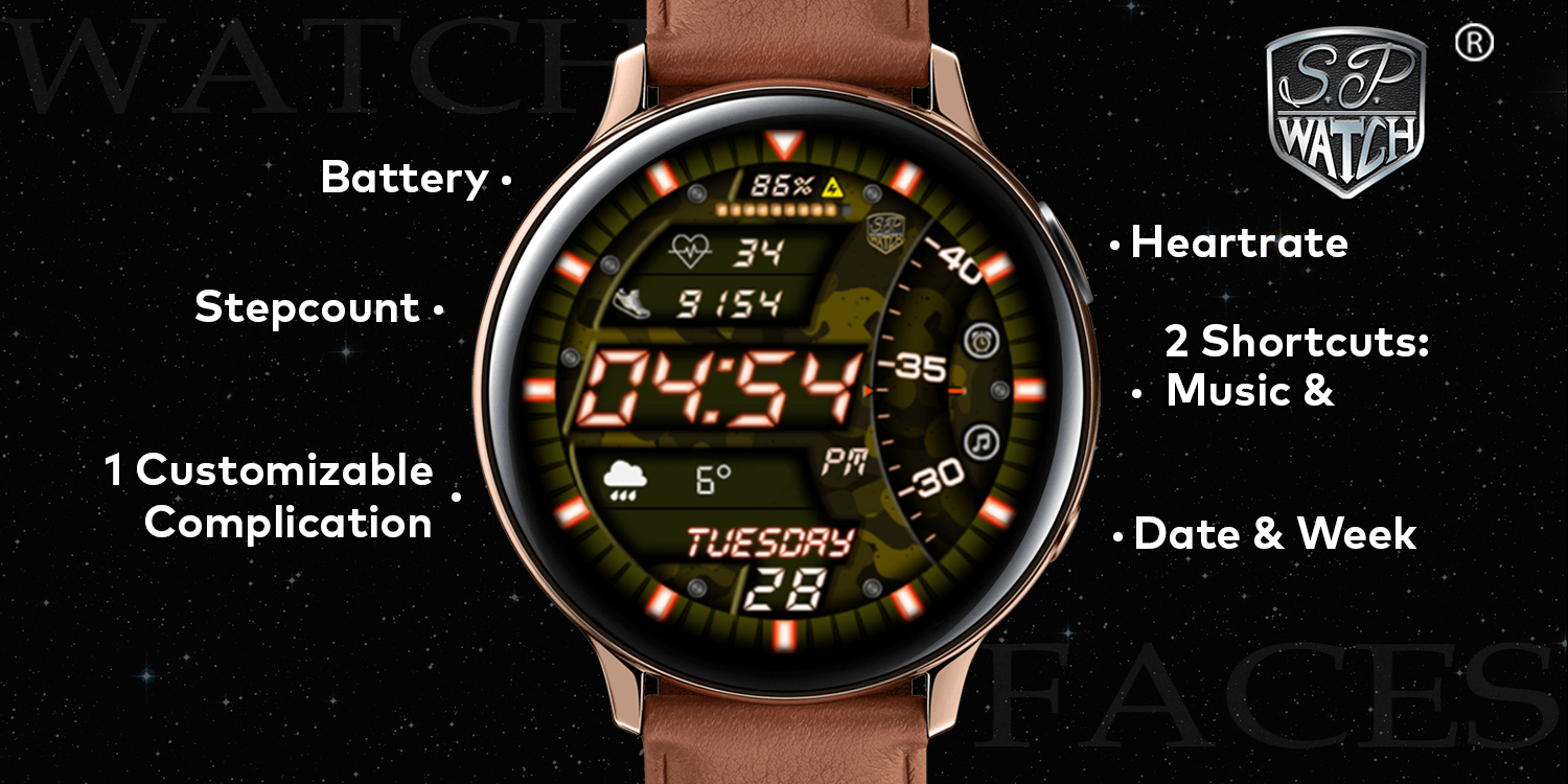 It contains week & date, Steps, Heart rate, 2 Shortcuts (music and alarm clock) and 1 customizable complications where you can have the data you prefer such as weather, uv index, world clock (etc).