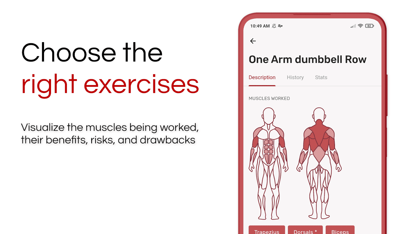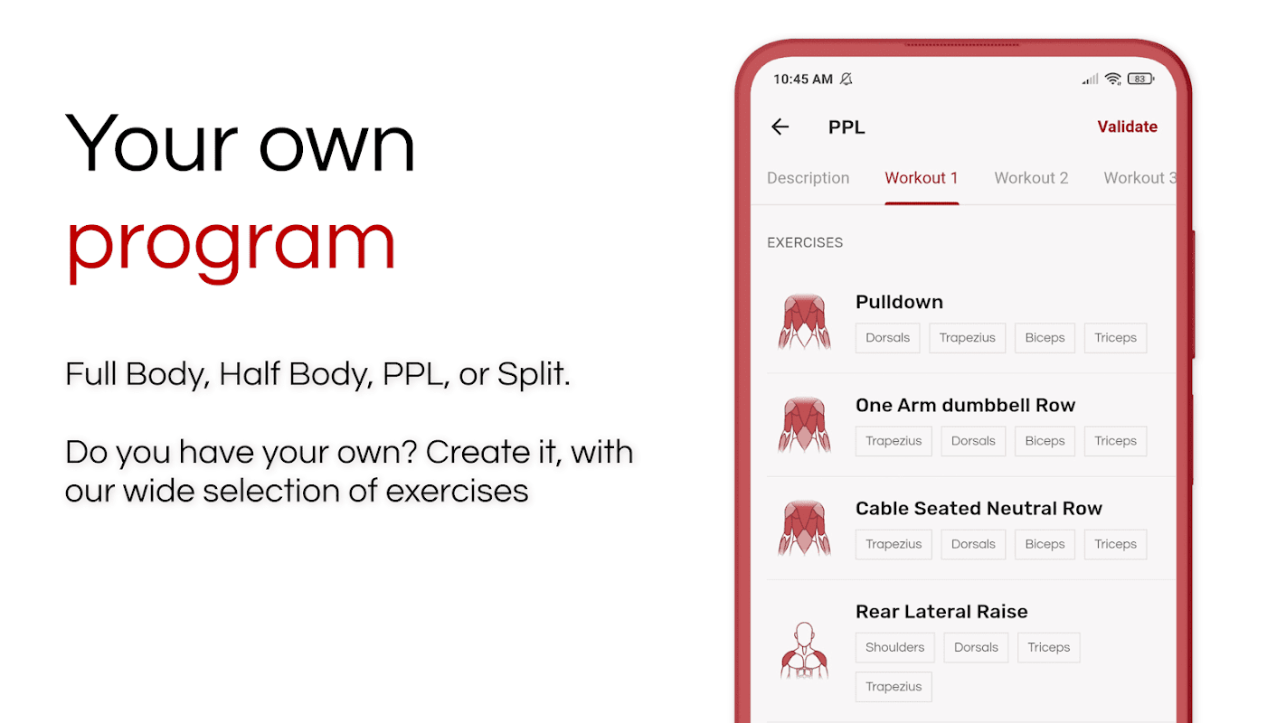 We tell you exactly what to do for each session, specifying the number of sets, reps, weight, and rest times.