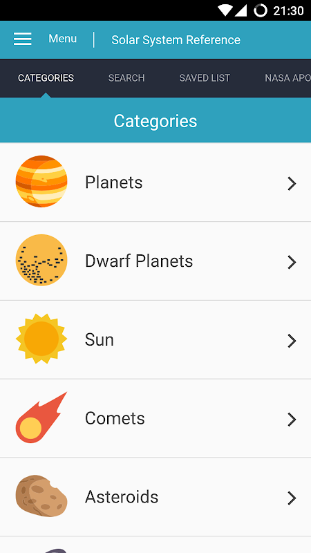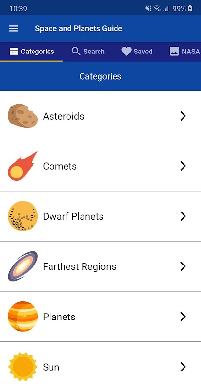 This app allows you to search for and save your selected solar system topic for quicker access helping you to study the various space material in an intuitive manner.