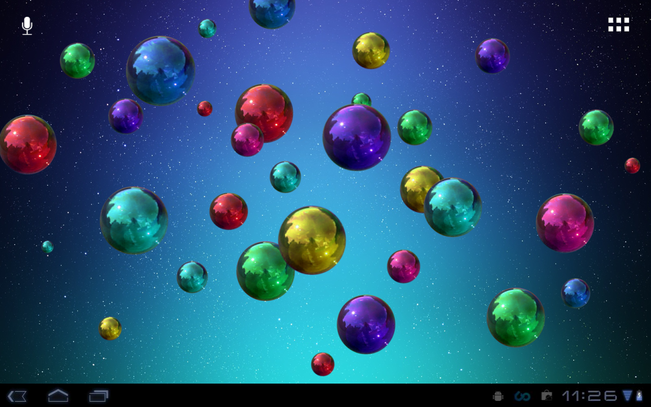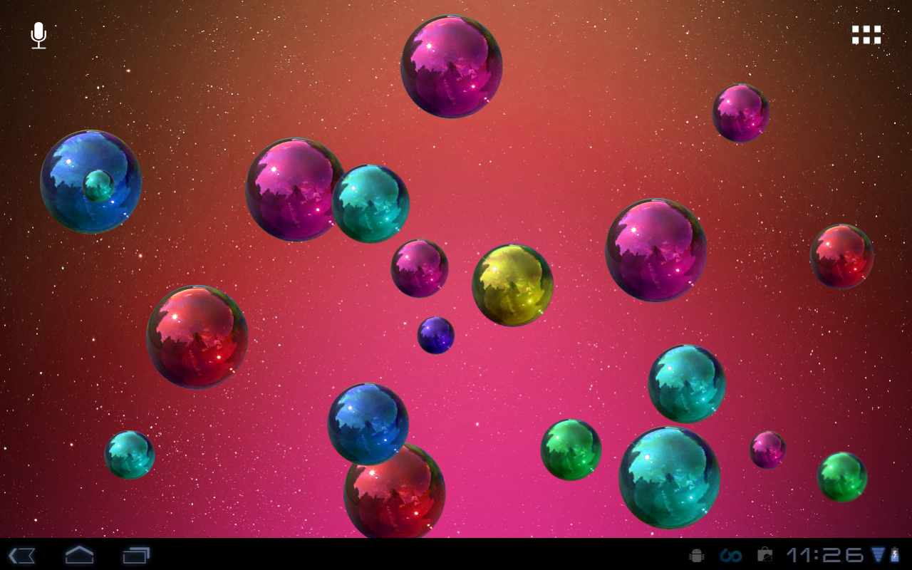 Space Bubbles is a great live wallpaper to have on your home screen because of the classy colored HD bubbles and awsome background themes. With Space Bubbles you can do almost everything, you can set number of bubbles, speed, direction, color of bubbles, change background etc. Also you can play, pop as many bubbles you can whith a simple touch.