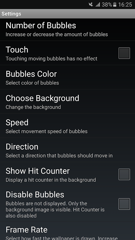 * FRAME RATE - Select how fast the wallpaper is drawn. Increase for smoother animations or decrease for improved battery life. Adapt your frame rate on your phone or tablet (higher is better)