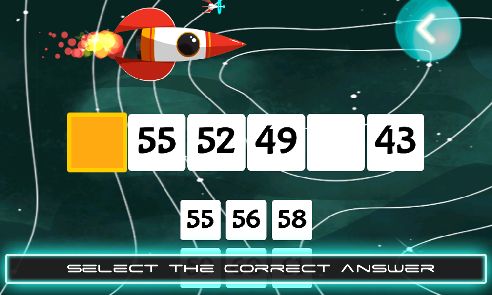 The game offers 60 planets contain forward and backward for each of the 4 levels of difficulty random series. In each series must find missing numbers. In addition, during your trip you will tour several galaxies and enjoy mini-action games. You can also get different upgrades for your rocket and many trophies.