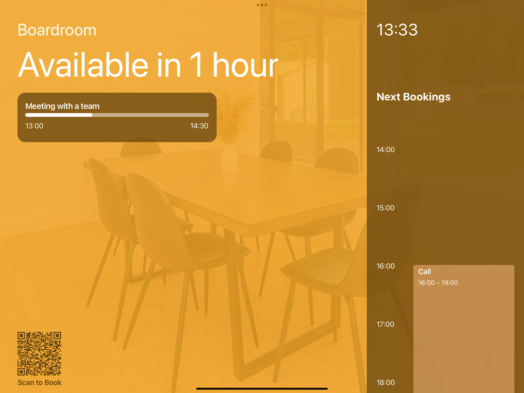 The Spacebring Room Display app allows shared and coworking space users to check in for meetings, view upcoming schedules, see room availability at a glance with clear indicators, and book conference rooms on the spot by scanning a QR code. The interface is customizable with meeting room photos, enhancing the professional look of your space.