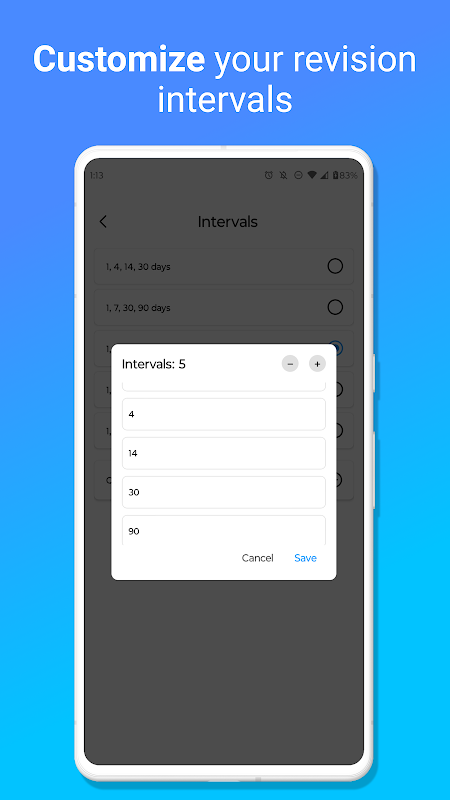 • Customizable intervals: Tailor your revision schedule to suit your needs.