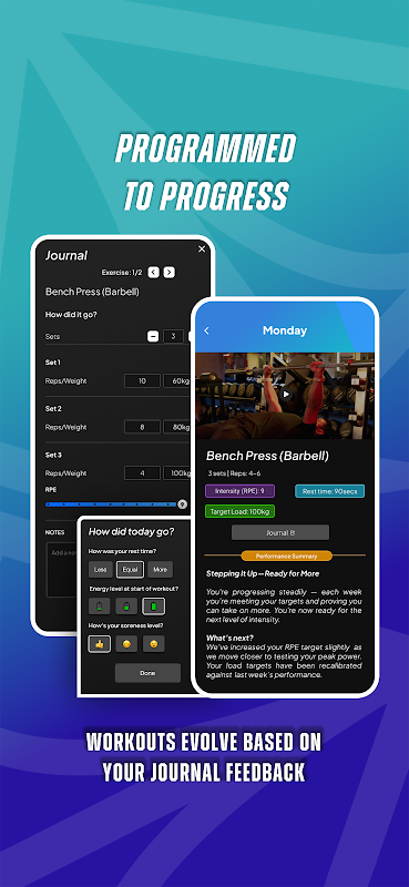 Your programme updates weekly based on feedback from your in-app training journal, fine-tuning crucial variables like intensity, volume, and exercise selection — with built-in RPE tracking and fatigue monitoring. Enjoy a fully personalised fitness experience, like having an elite coach guiding every rep.
