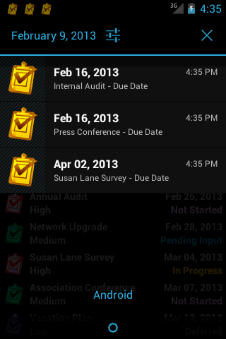 Reminder option provides reminder notifications of Due Dates that are stored for a task. Reminders are executed and notified automatically with attractive icons and respective details.