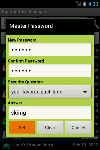 Sparkle Task Manager is protected by a Master Password. User can set their Master Password with Security Questions and Answers. Master Password prevents unauthorized use of your Secure details by others. It makes your details more safe and secure.
