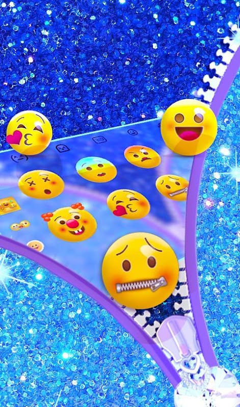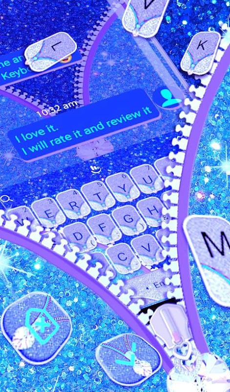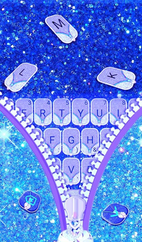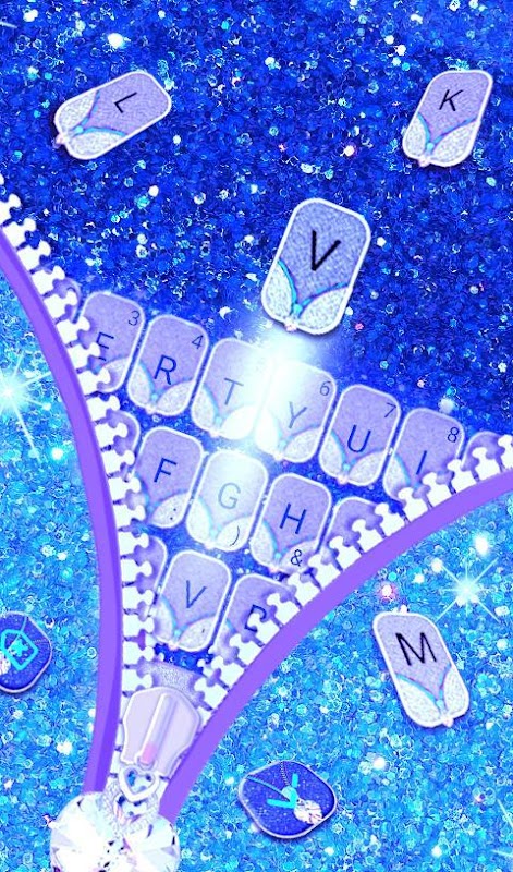 Free download of Sparkling Blue Zipper keyboard theme with glitter background.