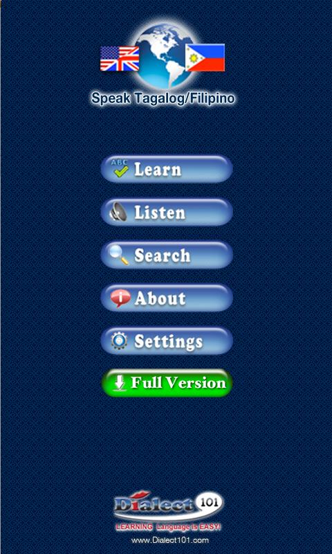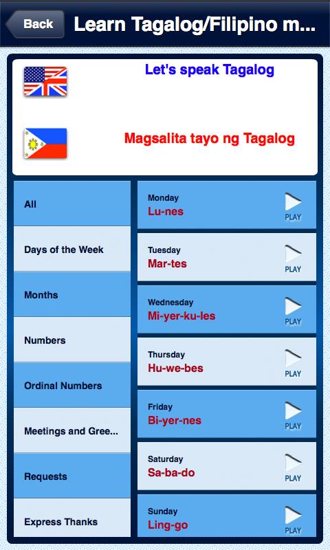 For TABLETS and PHONES. A great tool for English speakers to learn the Tagalog language. As the basis of Philippine national language Filipino, Tagalog remains a common language between Filipino communities from different ethnic background all over the world. Speak Tagalog provides anyone with Filipino descent to learn their mother tongue or for any English speaker who wants to visit the Philippines and enjoy Filipino hospitality and Filipina beauty.