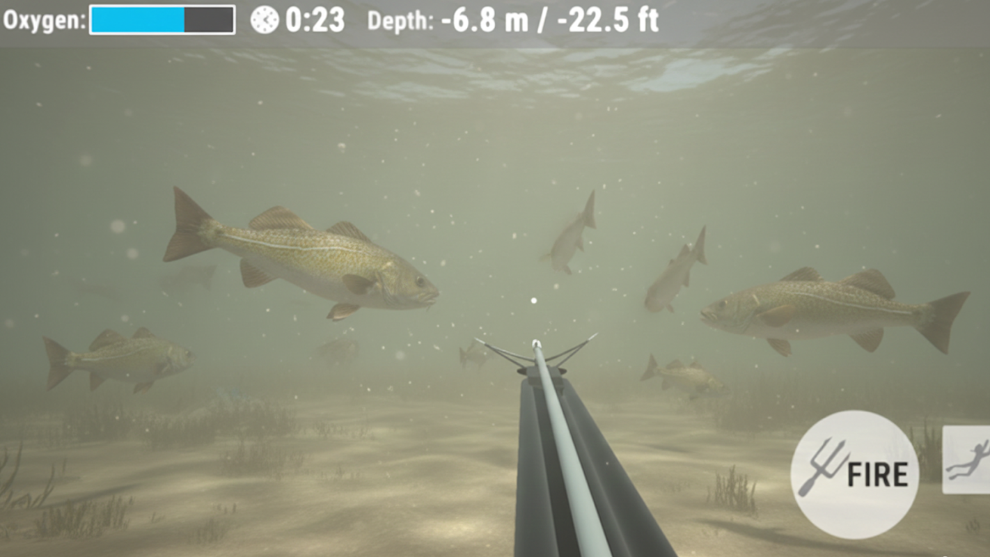 - Simulation: Close to real life spearfishing. Oxygen level and consumption is realistic, fishes can be spooked easily.