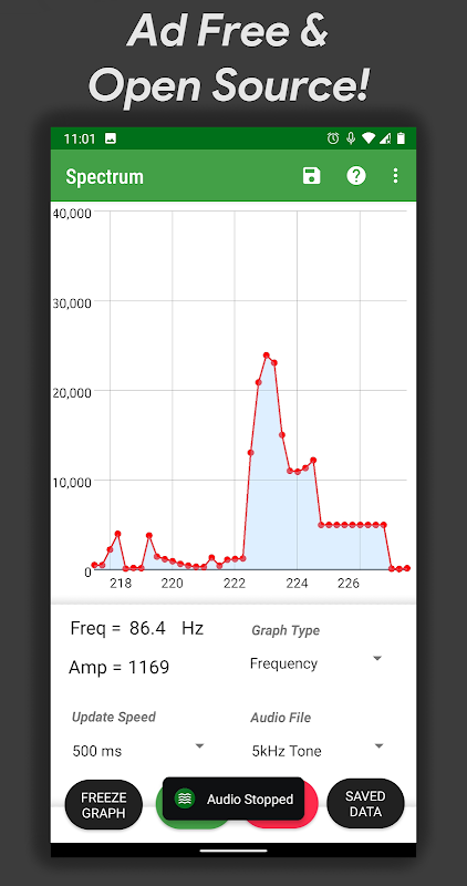 • View real-time amplitude and frequency data from the phone