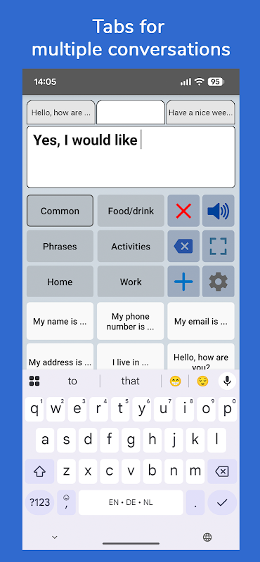 With the app you can create categories and phrases, which are placed on buttons. With these buttons you can create messages that can be shown or spoken (text-to-speech). It is also possible to type any text using the keyboard.