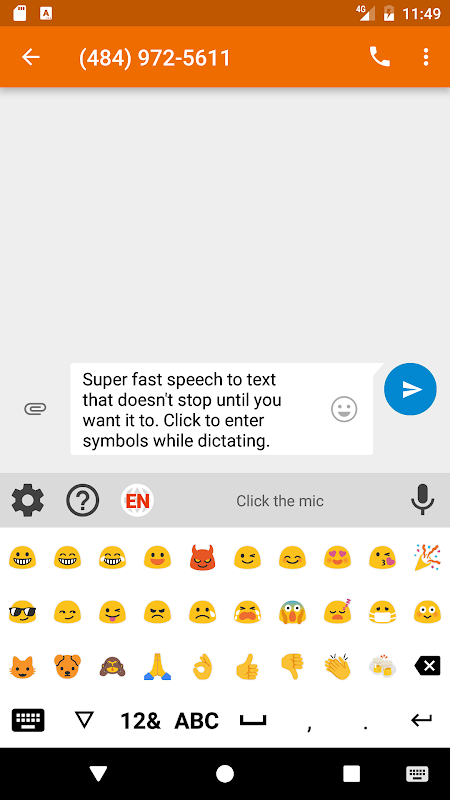 Type unlimited at the speed of speech. Click the mic and start dictating. Unlike regular voice-typing - it will never cut you in the middle. You don't have to click again and again to restart it. We mean it - we're talking about whole assays - thousands of words - written in the speed of your speech. You can now voice-type while you're walking, driving or working around the house. Want to insert a mark, symbol, or emoji? Do it while in dictation mode - no need to stop - and go back. This way - you can dictate punctuation marks if you like - but you don't need to - you can insert with a single click if you prefer. The result is super fast, accurate and easy voice typing.