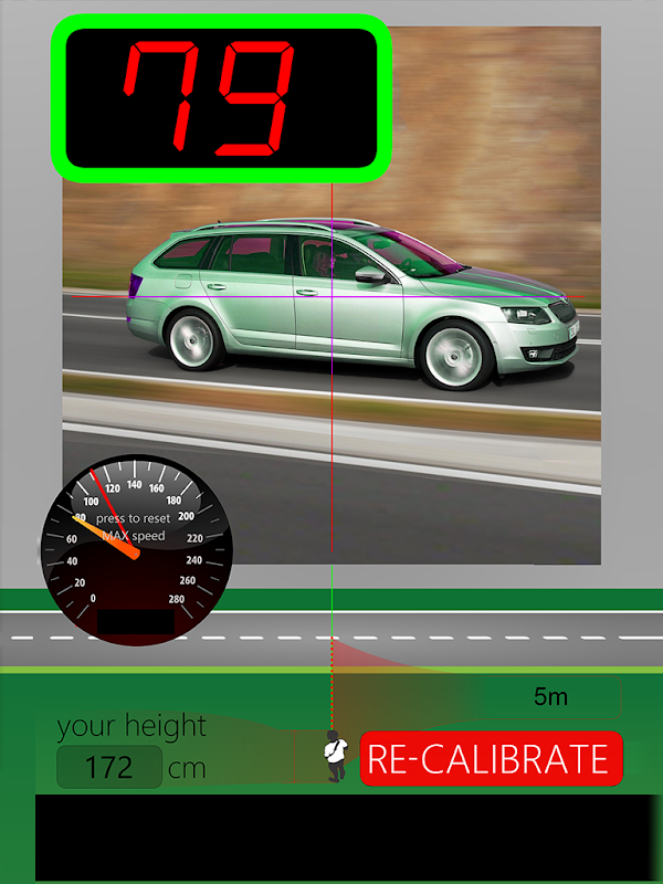 Enter your height, hold your phone to shoulder level (that is you normally do), point the thin red cross perpendicularly to the lane where cars are crossing and press CALIBRATE. Now you just have to follow the cars to get their speeds!