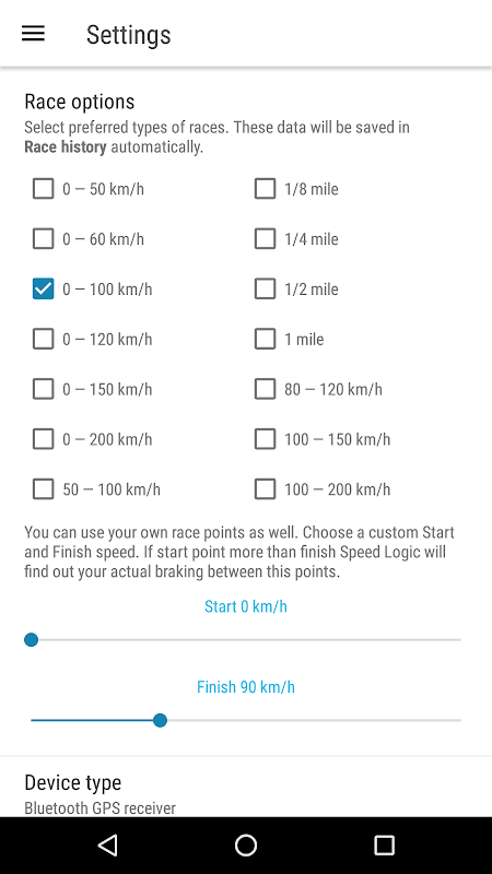 Speed Logic supports various types of external Bluetooth and USB GPS/GLONASS receivers such as Racelogic VBox Sport 20Hz, UBlox USB 6x, 7x and 8x series dongles with refresh rate up to 20 Hz, QSTARZ 5 and 10Hz receivers, Garmin, GlobalSat and other gadgets with NMEA 0183 standart. Also you can use OBD ELM327 Wi-Fi and Bluetooth adapters connected direct to your vehicle.