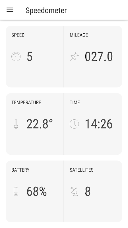 Use Speed Logic as a handy speedometer with number of extra features such as instant mileage and speed in kilometers, miles or knots, thermometer in Celsius and Fahrenheit, atmospheric pressure and humidity, satellite connection info, clock and battery level.