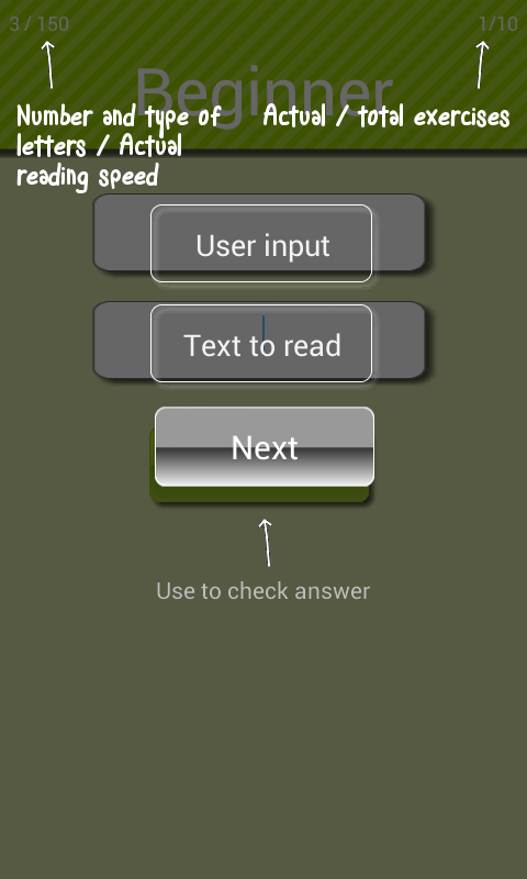 "Speed reading game" shows for the short time numbers, or combination of numbers and letters. You have to catch it and repeat it in correct order. If you catch at least 50% of the one game (10 tests), new level unlock.