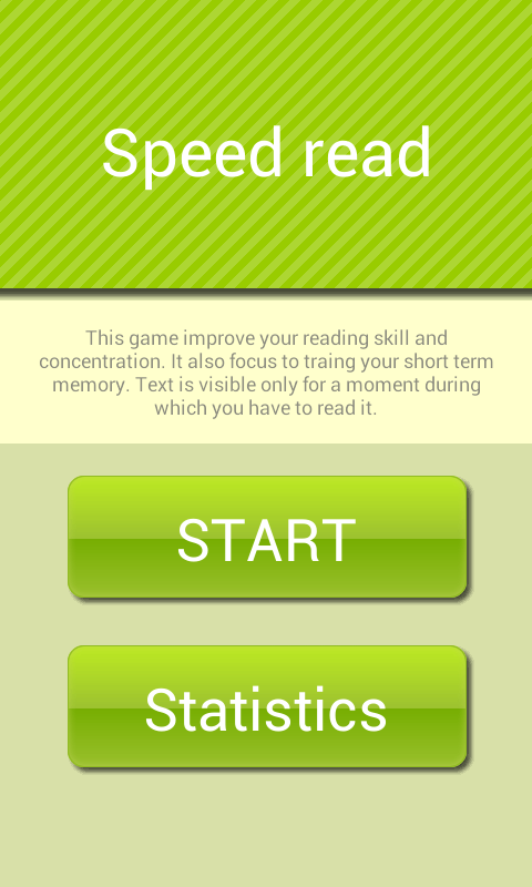 "Speed reading game" application helps you to train your reading skill. It focuses on the visual span, length of the string of characters that our eyes are able to capture in one eye movement. Improving this knowledge help you to read faster and keep good understanding of read text. It also trains concentration and short term memory.