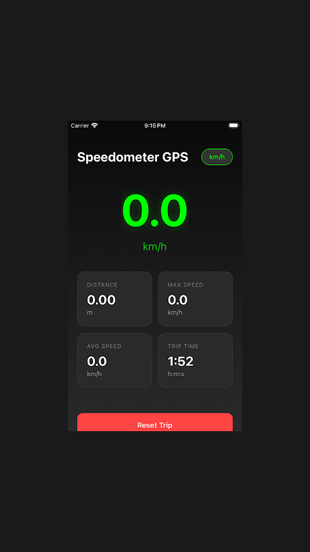 Simply open the app and grant location permission. Tracking starts automatically. Your current speed displays prominently in the center, with trip statistics shown below. Tap the unit button to switch between metric and imperial units. Use the Start/Stop button to pause tracking, or Reset to clear your trip data and start fresh.