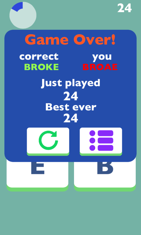 - Choose correct letter to form a correct word in English in a very tight timing. If your result word in English dictionary, your got the point)