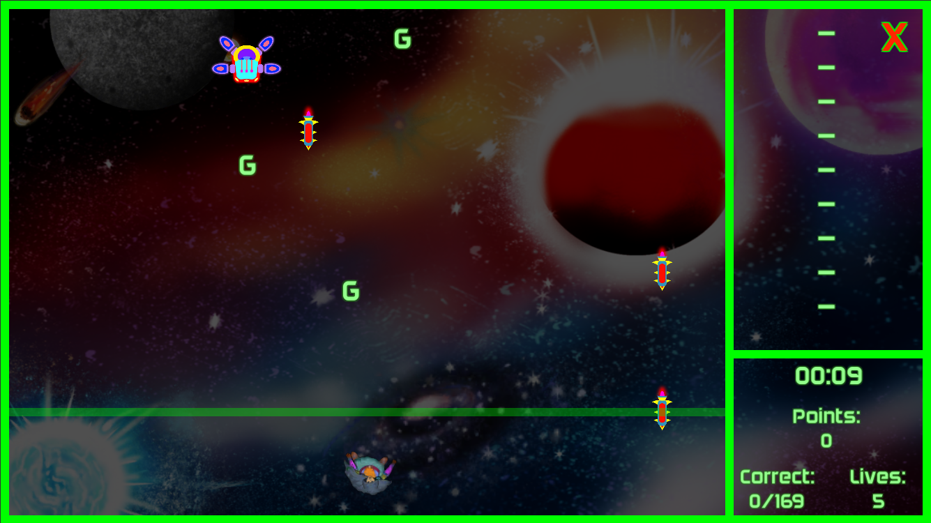Mean while bad guys are dropping bombs at the vador. If the bombs hits vador, he lose a life. If he hits wrong letter he also lose a live.