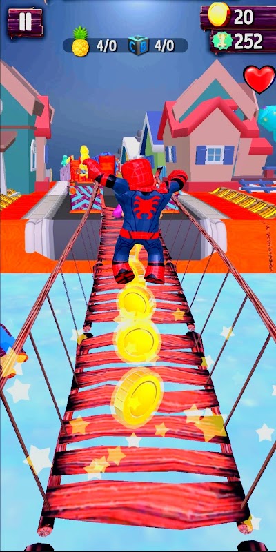 Run & smash with your favourite hero Spiderman. Cut coins to release your friends from the prisons of jungle. Avoid obstacles and gain superpowers as you progress. You will sure enjoy playing this amazing 3D game which features: