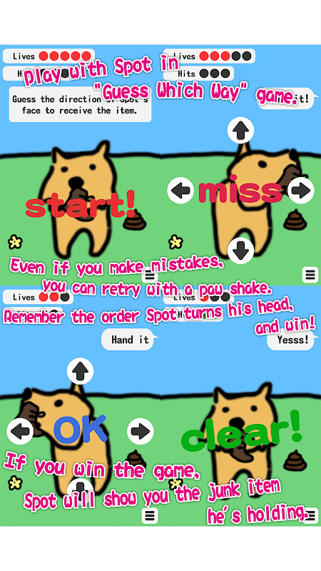 Engage in games with Spot to receive the collected items. Remember the sequence in which Spot turns his head and compete in the 'Guess Which Way' game. When you win, Spot lets go of the item and proudly shows it to you.
