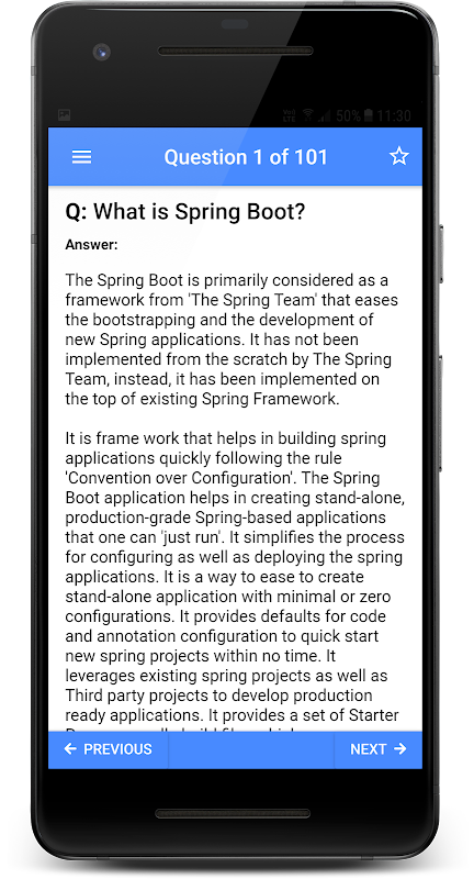 Spring Boot Interview Questions and Answers is a simple Android application that lists down 100+ most commonly asked Spring Boot interview Questions with Answers represented in an intuitive fashion.