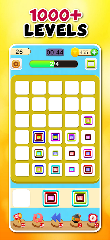 Square Sort Mania is a fresh, addictive hybrid casual puzzle game. Players place layered square blocks, each with four concentric colored layers onto a grid. If the outermost color of the placed block matches the outermost color of any adjacent block, both blocks destroy in a satisfying pop.