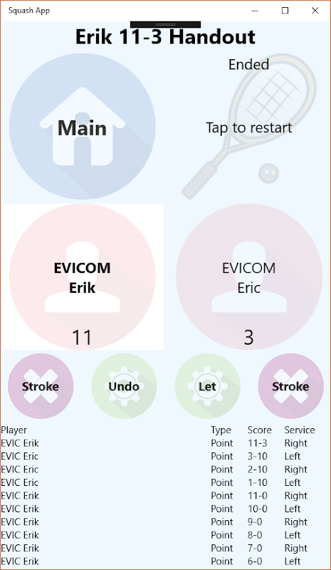 SquashApp makes it easier to keep score during the game. It also saves historical information to a website where you can have a look at your total achievements. With the tournaments you can share your information with other users and devices.