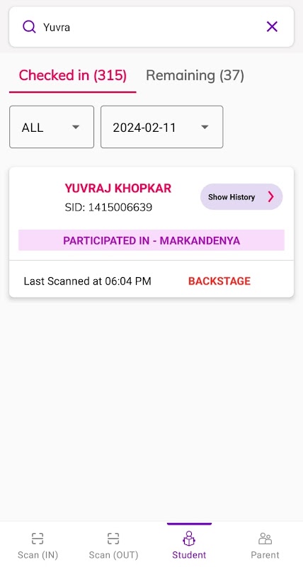 Helps school staff to mark attendance of students in event, and also check history of checkins and remaining students or parents.