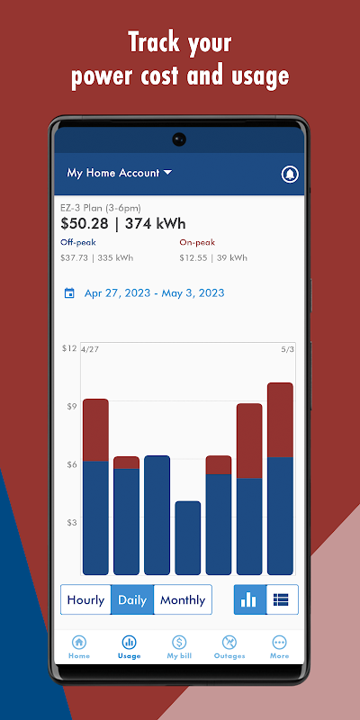 Daily Cost and Usage: Get a snapshot of your energy costs and usage by the hour, day or month. If you’re enrolled in one of our time-of-day plans, you can see how much energy you have used during on-peak and off-peak hours to optimize your savings. You can even see your projected bill amount on the home screen.