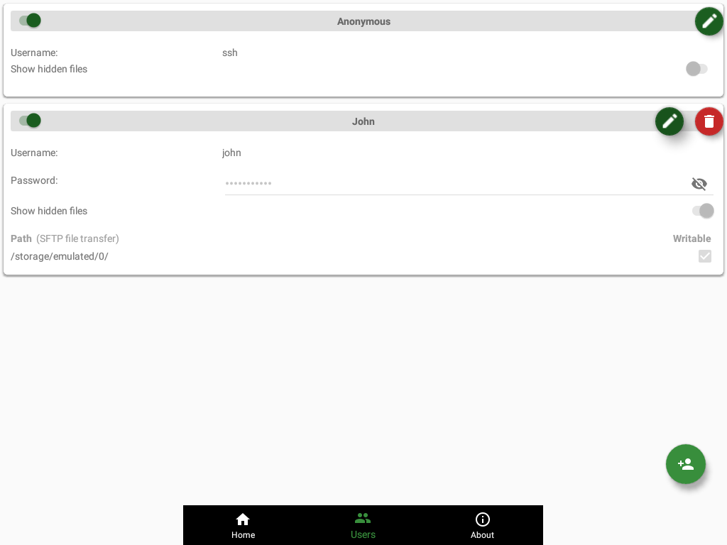√ [SFTP feature] Multiple access paths for each user: Any folders in your internal storage or external sdcard