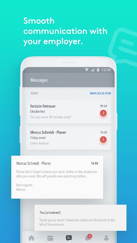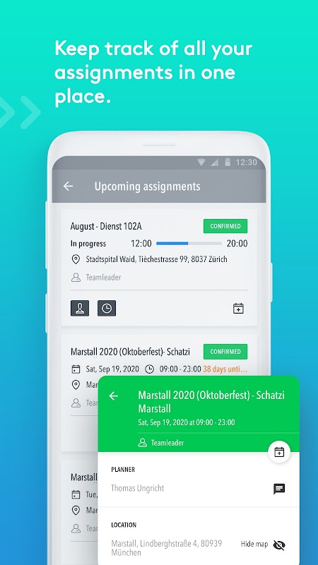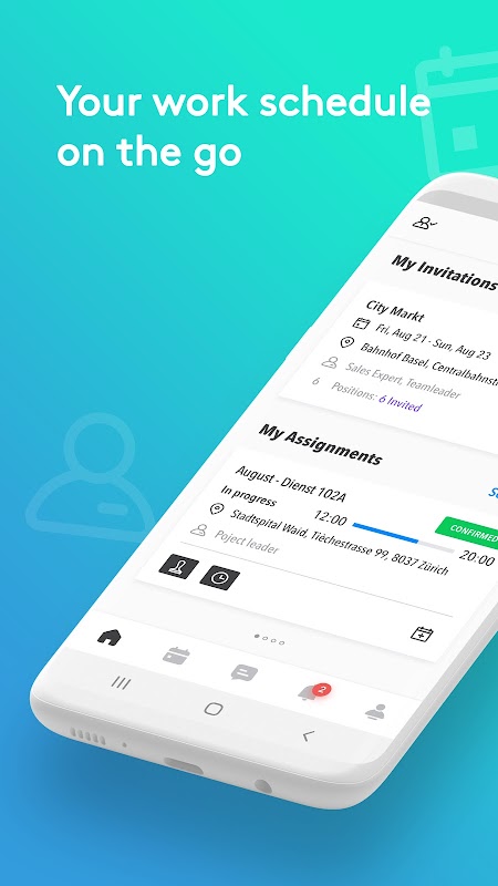 Staffcloud keeps you up-to-date on your job assignments. Your scheduling and your communication with your employer will be a walk in the park. The app provides you with all the important information about your assignments, such as the working time, the location or all crucial documents. Synchronize your personal calendar with your scheduled jobs in the app and make sure that you will be reminded for your jobs. The internal communication system makes your communication with your employer pretty easy. You are able to manage all your personal data which helps your employer to be up-to-date about all your changes.
