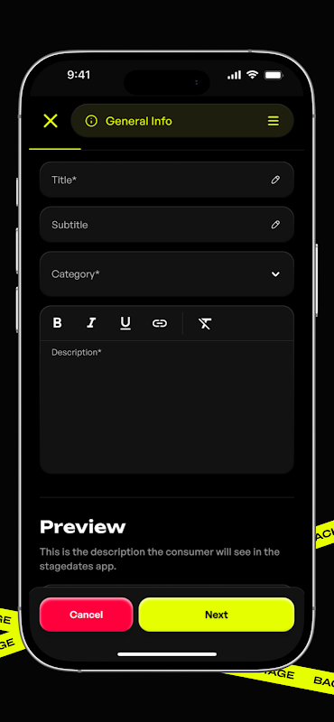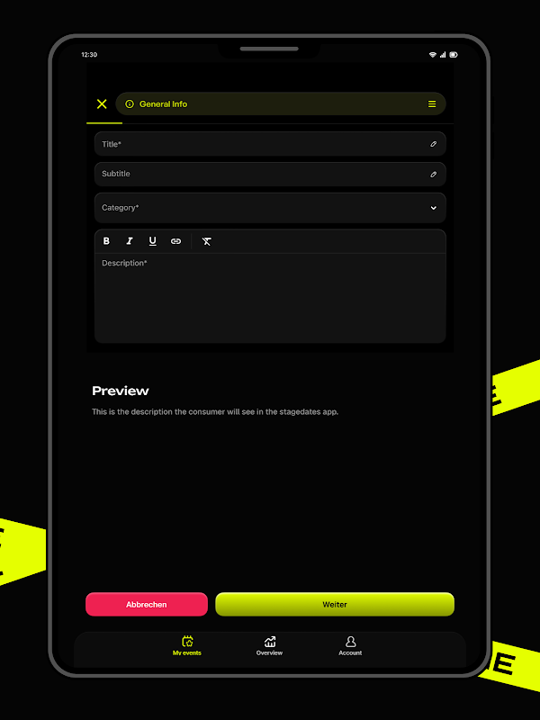 For promoters with a plan - the backstage app from stagedates offers you everything you need to take your events to the next level. Create and edit events on the go, view attendee lists, manage guest lists and analyze sales figures in real time. With our super intuitive user interface, you'll always have all the tools you need at your fingertips.
