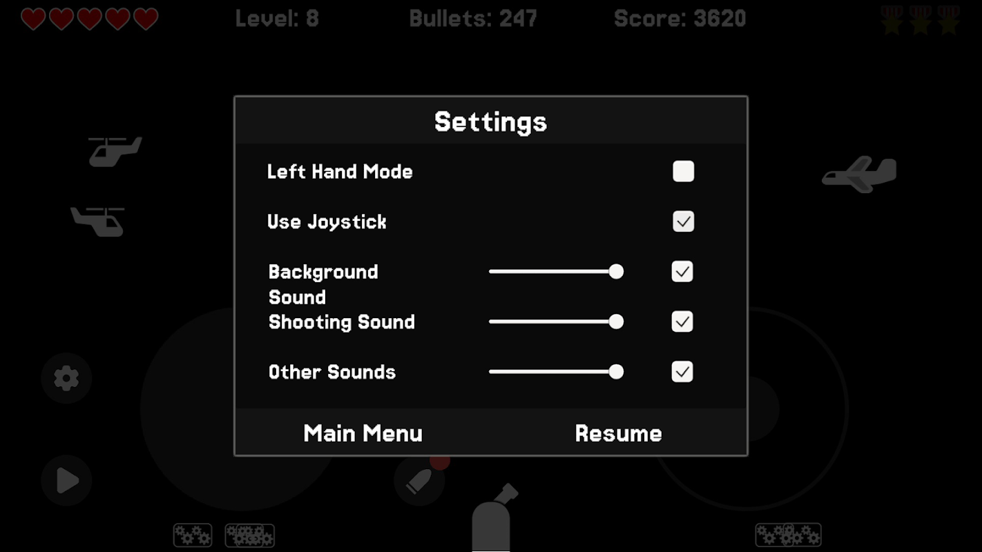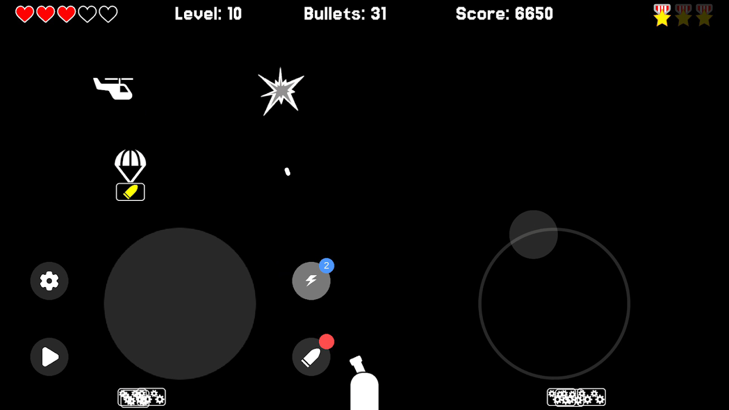 Enemy waves evolve as the game progresses. Helicopters release parachuted ToolBoxes that can be destroyed while descending. Any ToolBox that reaches the ground safely will join others and merge into Tanks, creating ground pressure. Bombers drop angled bombs aimed directly at the Shooter; if not intercepted in time, they reduce health. Fighter Jets deploy EMP devices that temporarily disable rotation and firing.