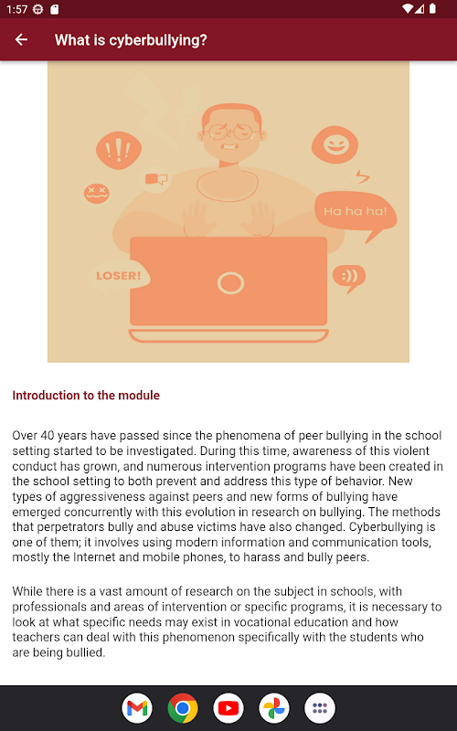 It is composed of five modules covering the following topics: 1. What is cyberbullying? 2. How to detect cyberbullying in the VET classroom. 3. How to behave in case of discovering a case of cyberbullying. 4. How to prevent cyberbullying in the VET classroom. 5. How to start a conversation in the classroom about cyberbullying. The information included in the modules is practical and includes examples of exercises and activities that can be carried out in the VET classroom.