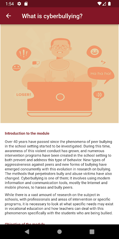 The app is constituted as a data repository as well as an interactive environment where to respond / reflect on specific situations that may constitute cyberbullying. In this way, the user will be able to access contact information for cases of cyberbullying at a local, national and European level, explore a repository of useful resources such as mobile apps, tools and access the Training Curriculum for VET trainers „Fight against a cyberbullying!”.