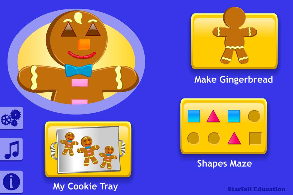 The Starfall Gingerbread app is a delicious way to learn 2D and 3D shapes. Children choose a girl or boy cookie, then decorate it with shapes and colors. In this App edition, create a tray of gingerbread cookies, then choose a favorite cookie to run through a maze following shapes or shape patterns. For accessible content visit www.starfall.com/h/accessibility.php