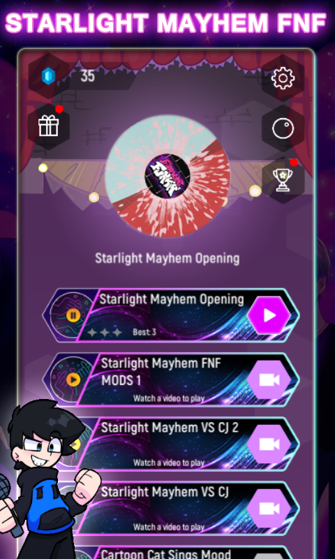 1- choose your favorite song from the playlist in our FNF Starlight Mayhem CJ Mod Tiles Hop